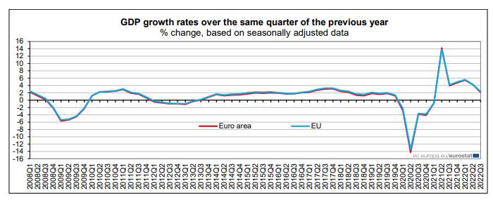 Επιστρέφοντας στα της ανάπτυξης, κατά το γ’ τρίμηνο του 2022 σημειώθηκε αύξηση του ΑΕΠ κατά 2,1% στην Ευρωζώνη και κατά 2,4% στην ΕΕ σε σύγκριση με το γ’ τρίμηνο του 2021.