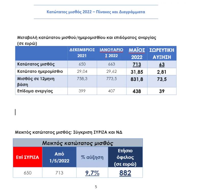 Αν συνυπολογισθεί και η προηγούμενη αύξηση του κατώτατου μισθού που έγινε την 1η Ιανουαρίου 2022, προκύπτει αύξηση κατά 9,7 %, ή 63 ευρώ το μήνα (από 650 ευρώ στα 713 ευρώ). Δεδομένου ότι καταβάλλονται 14 μισθοί, το όφελος από την διπλή αύξηση του κατώτατου μισθού το 2022 διαμορφώνεται στα 882 ευρώ ετησίως (63 ευρώ επί 14 μισθούς).
