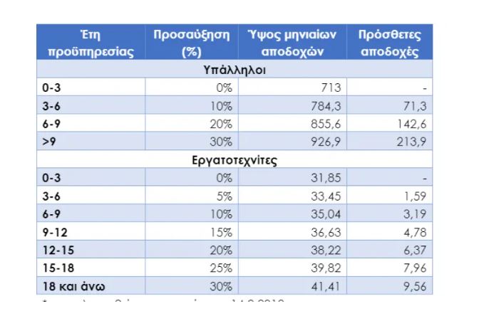 Για τους εργαζόμενους που έχουν προϋπηρεσία οι αποδοχές είναι αυξημένες κατά έως και 213 ευρώ το μήνα.