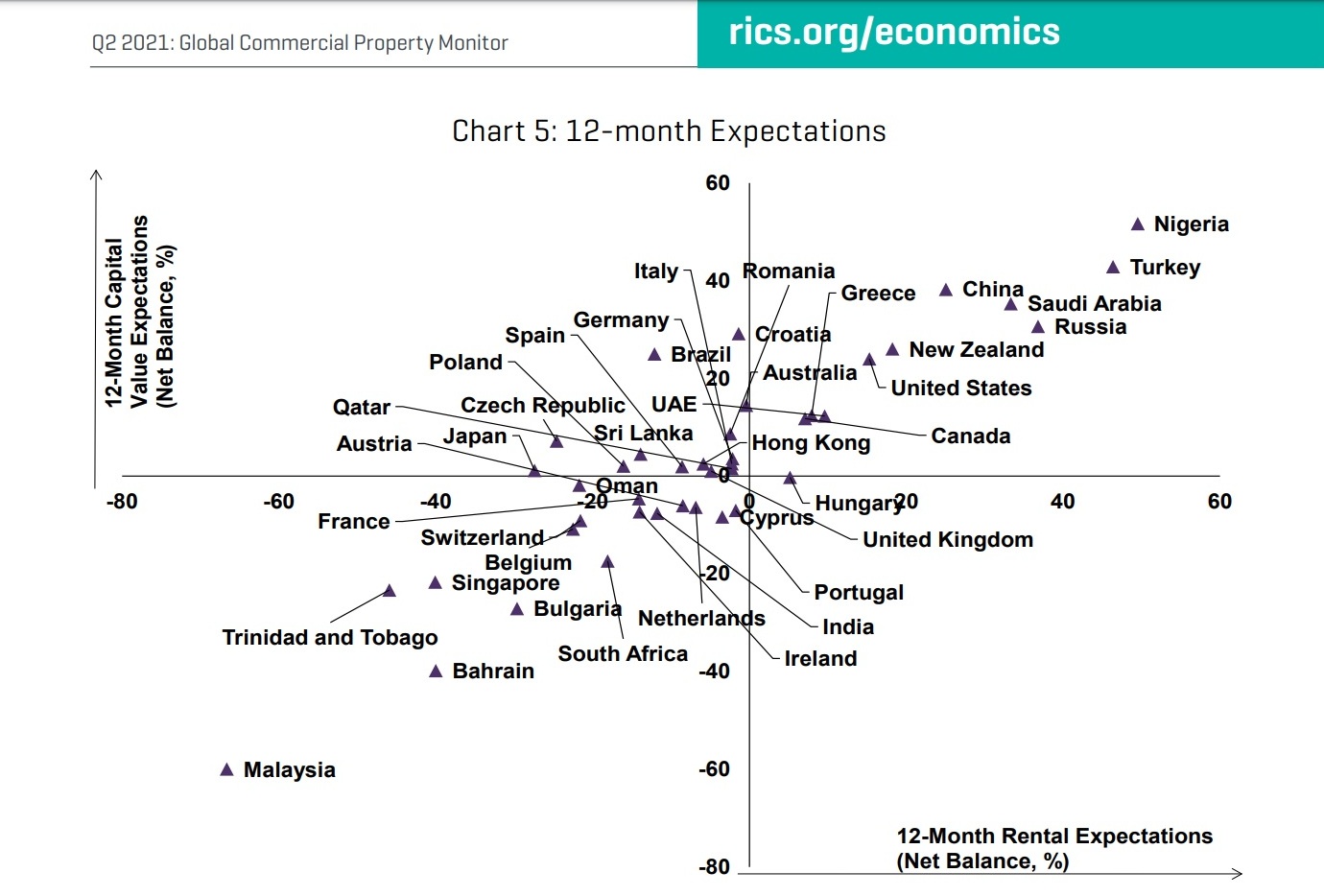 Ωστόσο, η πιο πρόσφατη έκθεση από το δεύτερο τρίμηνο του 2021 του Global Commercial Property Monitor του RICS (δηλαδή της Παγκόσμιας Επισκόπησης του RICS για τα Εμπορικά Ακίνητα), δείχνει πως ενώ οι ιδιοκτήτες ακινήτων και οι επενδυτές σε παγκόσμιο επίπεδο αναμένουν μια διστακτική ανάκαμψη, «έντονη αισιοδοξία διαφαίνεται στην Ελλάδα, καθώς το 80% των ερωτηθέντων δήλωσαν ότι πιστεύουν πως η αγορά παρουσιάζει ανοδική πορεία».