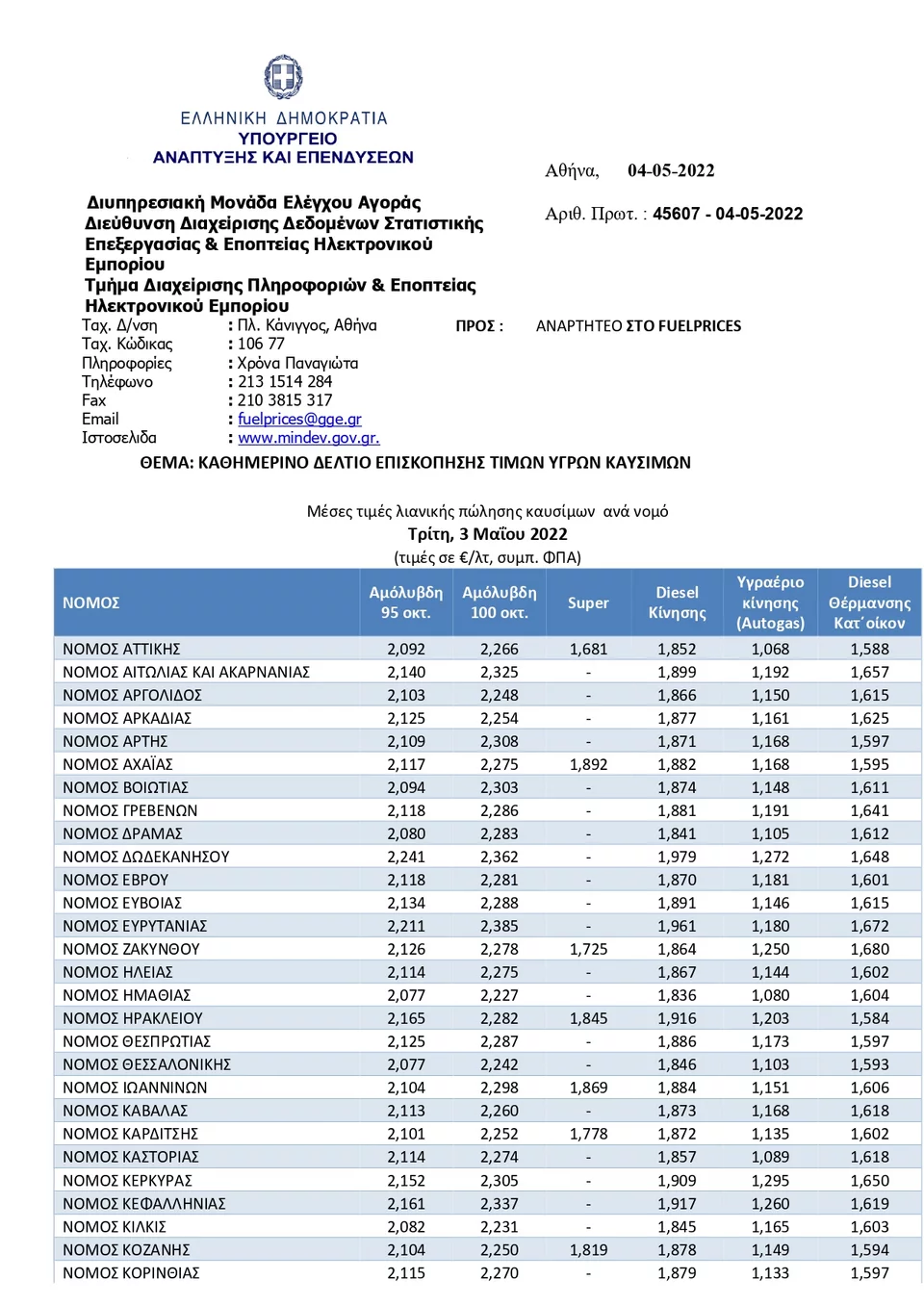 Φυσικά το πρόβλημα δεν περιορίζεται στη βενζίνη. Παρά την οριζόντια επιδότηση στο πετρέλαιο κίνησης, η τιμή του διαμορφώνεται περίπου 25 λεπτά υψηλότερα από τα επίπεδα της 24ης Φεβρουαρίου, στα 1,872 ευρώ. Ειδικά όσον αφορά στο πετρέλαιο κίνησης οι διακυμάνσεις του προκαλούν διπλό πονοκέφαλο στο οικονομικό επιτελείο, καθώς επηρεάζει το κόστος των μεταφορών και συμβάλλει στην ανατροφοδότηση του κύκλου των ανατιμήσεων στην αγορά. Η παράταση της οριζόντιας επιδότησης ως το τέλος Ιουνίου είναι μονόδρομος κι από εκεί και πέρα η απόφαση θα είναι συνολική για το «αγκάθι» των καυσίμων.