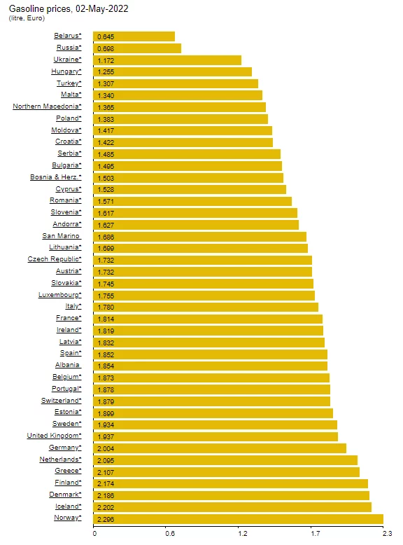 Σημειωτέον ότι στις 24 Φεβρουαρίου, όταν ξεκίνησε ο πόλεμος στην Ουκρανία, η τιμή της αμόλυβδης ήταν στα 1,892 ευρώ, με τη διεθνή τιμή του πετρελαίου να «παίζει» στα 85 δολάρια. Στην περίπτωση που μπει κανείς στη διαδικασία να κάνει συγκρίσεις, μάλλον θα απογοητευθεί, καθώς οι Έλληνες πληρώνουν την 5η ακριβότερη βενζίνη, με τους Νορβηγούς, τους Ισλανδούς, τους Δανούς και τους Φινλανδούς να πληρώνουν κάτι παραπάνω, αλλά με υψηλότερο κατά κεφαλήν εισόδημα.