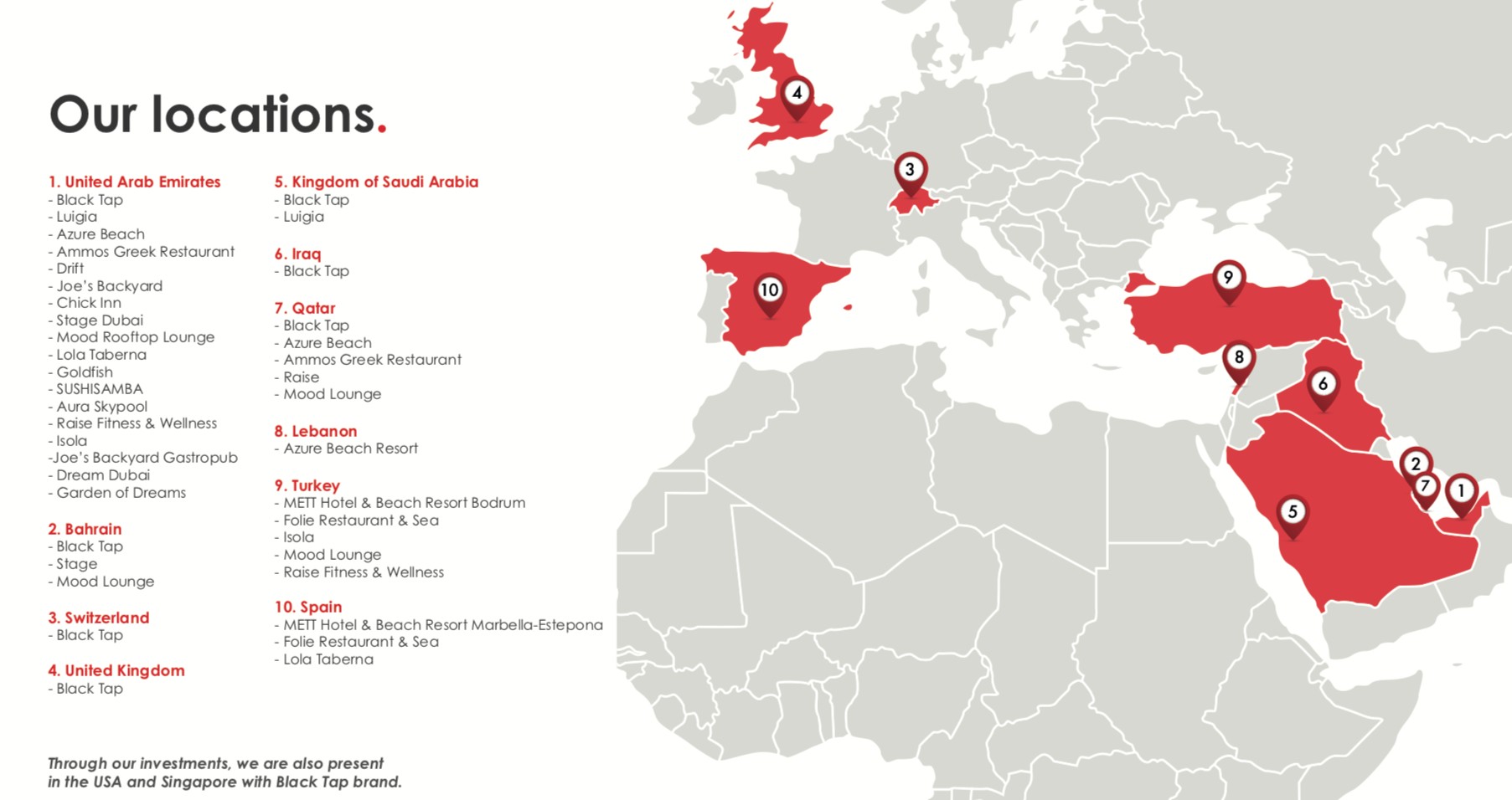 H Sunset Hospitality Group (SHG) η οποία ιδρύθηκε το 2011 διαθέτει σήμερα παρουσία σε δέκα χώρες – πάνω από την μισή δραστηριότητα της όμως συγκεντρώνεται στο Ντουμπάι – με 26 διαφορετικά brands και για φέτος στόχος είναι στο χαρτοφυλάκιο του να προσθέσει πάνω από 50 χώρους (ξενοδοχεία, εστιατόρια, καφέ και χώρους διασκέδασης) σε 14 χώρες – μεταξύ των άλλων σε Ελλάδα και Ισπανία – έως το τέλος του τρέχοντος έτους.
