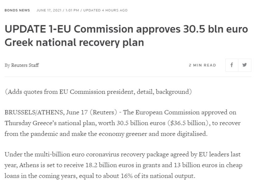 «Η ΕΕ εγκρίνει το πλάνο της Ελλάδας 30,5 δισ. ευρώ» γράφει το Bloomberg, σημειώνοντας ότι όπως ανακοίνωσε η Κομισιόν, το σχέδιο της Αθήνας πραγματεύεται αποτελεσματικά το σύνολο ή ένα σημαντικό υποσύνολο οικονομικών και κοινωνικών προκλήσεων που περιγράφονται σεις συστάσεις από το Ευρωπαϊκό Συμβούλιο.