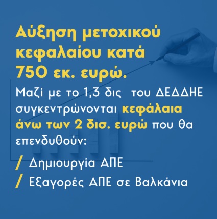 Η αύξηση του μετοχικού κεφαλαίου της ΔΕΗ είναι ένα ακόμα βήμα για την ανάπτυξη της εταιρείας και τη μετεξέλιξή της σε μια ισχυρή περιφερειακή δύναμη στο χώρο της ενέργειας. Μετά την οικονομική της εξυγίανση, τον λειτουργικό της εκσυγχρονισμό και την αναβάθμιση των υπηρεσιών της προς τους πελάτες της, συγκεντρώνει κεφάλαια ύψους άνω των 2,3 δισ. ευρώ (συμπεριλαμβανομένου και του εσόδου από την πώληση του 49% του ΔΕΔΔΗΕ) που θα της επιτρέψουν να προχωρήσει άμεσα σε δύο αναπτυξιακές κινήσεις. Αφενός σε επενδύσεις σε Ανανεώσιμες Πηγές Ενέργειας εντός Ελλάδας και αφετέρου σε εξαγορές παραγωγικών μονάδων «πράσινης» ενέργειας στα Βαλκάνια.