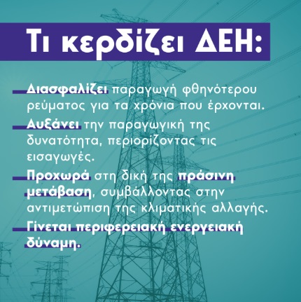 Συνεπώς, σήμερα η επιχείρηση, όχι μόνο δεν απαξιώνεται, αλλά αντιθέτως δυναμώνει και μπαίνει σε μια νέα «πράσινη» εποχή, διασφαλίζοντας την ενεργειακή ασφάλεια της χώρας, συμβάλλοντας στην αντιμετώπιση της κλιματικής αλλαγής και παράγοντας φθηνότερο ρεύμα για καταναλωτές και επιχειρήσεις.