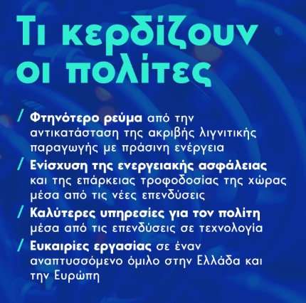 Με τις κινήσεις αυτές, η ΔΕΗ θα αυξήσει την παραγωγική της δυνατότητα, θα περιορίσει στο ελάχιστο την εξάρτηση της (και μαζί και της χώρας) από εισαγωγές, θα μειώσει το κόστος παραγωγής και θα διασφαλίσει χαμηλότερες τιμές για νοικοκυριά και επιχειρήσεις. Και όλα αυτά αντλώντας κεφάλαια από την αγορά, χωρίς να επιβαρυνθούν οι καταναλωτές ή το κράτος, ως βασικός μέτοχος της ΔΕΗ.