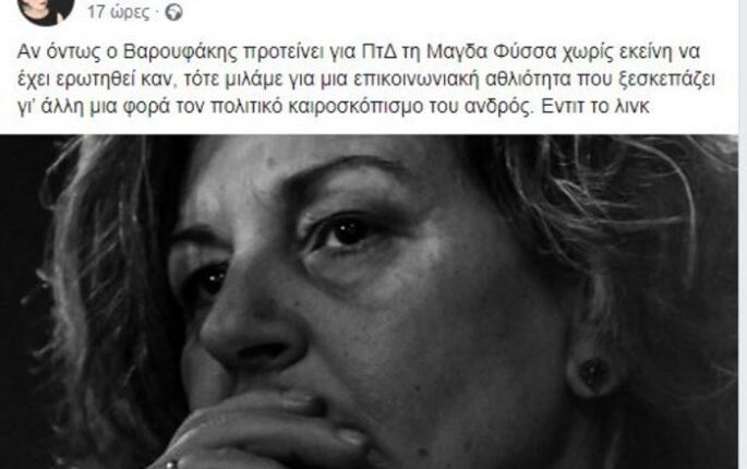 «Aν όντως ο Βαρουφάκης προτείνει για ΠτΔ τη Μαγδα Φύσσα χωρίς εκείνη να έχει ερωτηθεί καν, τότε μιλάμε για μια επικοινωνιακή αθλιότητα που ξεσκεπάζει γι’ άλλη μια φορά τον πολιτικό καιροσκοπισμό του ανδρός», έγραψε χαρακτηριστικά η Έλενα Ακρίτα σε ανάρτησή της στον προσωπικό της λογαριασμό στο Facebook.