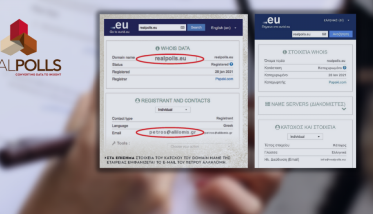 Ενώ τις προηγούμενες ημέρες από την αναζήτηση στο Διαδίκτυο σχετικά με τη RealPolls εμφανιζόταν στα επίσημα στοιχεία της επικοινωνίας του κατόχου του domain name το e-mail: [email protected], που παραπέμπει στον στενό συνεργάτη του οικονομικού γραφείου του κ. Τσίπρα όταν αυτός ήταν πρωθυπουργός, στοιχείο που δημοσιεύεται σήμερα στην εφημερίδα Παραπολιτικά, σήμερα ξαφνικά το σχετικό mail άλλαξε και εμφανίζεται η ηλεκτρονική διεύθυνση: [email protected].