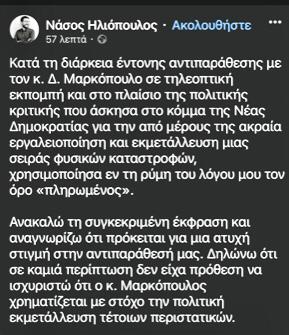 Τέλος μπήκε στη διαμάχη που είχε ξεσπάσει μεταξύ του εκπρόσωπου τύπου του ΣΥΡΙΖΑ και του βουλευτή Β’ Πειραιώς ΝΔ Δημήτρη Μαρκόπουλου, εφόσον ο Νάσος Ηλιόπουλος ανακάλεσε τα λεγόμενα του.