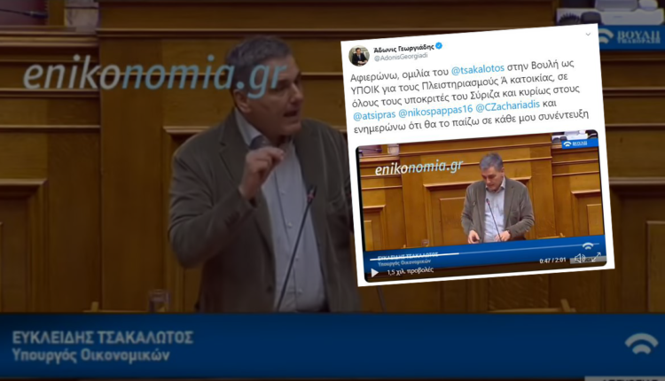 Ο κ. Γεωργιάδης αναφέρει χαρακτηριστικά: “Αφιερώνω, ομιλία του κ. Τσακαλώτου στην Βουλή ως ΥΠΟΙΚ για τους Πλειστηριασμούς Ά κατοικίας, σε όλους τους υποκριτές του Σύριζα και κυρίως στους Αλέξη Τσίπρα, Νίκο Παππά και Κώστα Ζαχαριάδη και ενημερώνω ότι θα το παίζω σε κάθε μου συνέντευξη”.