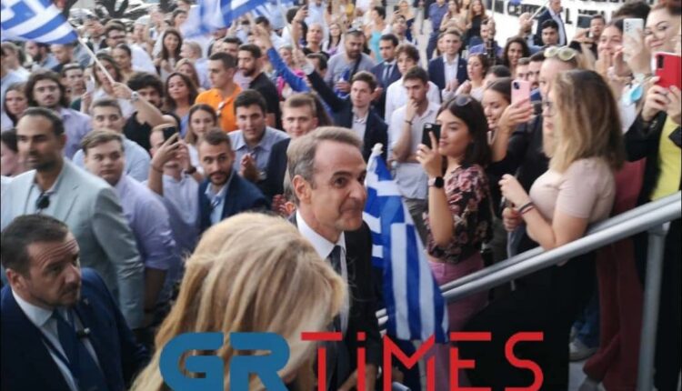 Ανάμεσα στο πλήθος κόσμου που περίμενε τον Κυριάκο Μητσοτάκη πάρα πολλοί νέοι οι οποίοι κρατούσαν ελληνικές σημαίες και φώναζαν σύνθημα της ΟΝΝΕΔ.