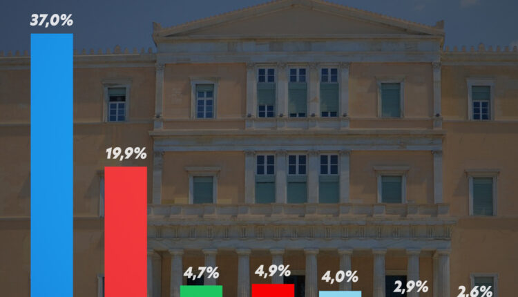 Ειδικότερα, το κυβερνών κόμμα συγκεντρώνει ποσοστό 37%, ο ΣΥΡΙΖΑ 19,9%, το Κίνημα Αλλαγής 4,7%, το ΚΚΕ 4,9%, η Ελληνική Λύση 4%, το ΜέΡΑ25 2,9%, η Δημιουργία Ξανά 0,7%, οι Έλληνες για την Πατρίδα 1,8%, άλλο κόμμα 2,6%, Λευκό – Άκυρο 1,7%, Δεν θα ψηφίσω 4,3% και Αναποφάσιστοι 15,5%.