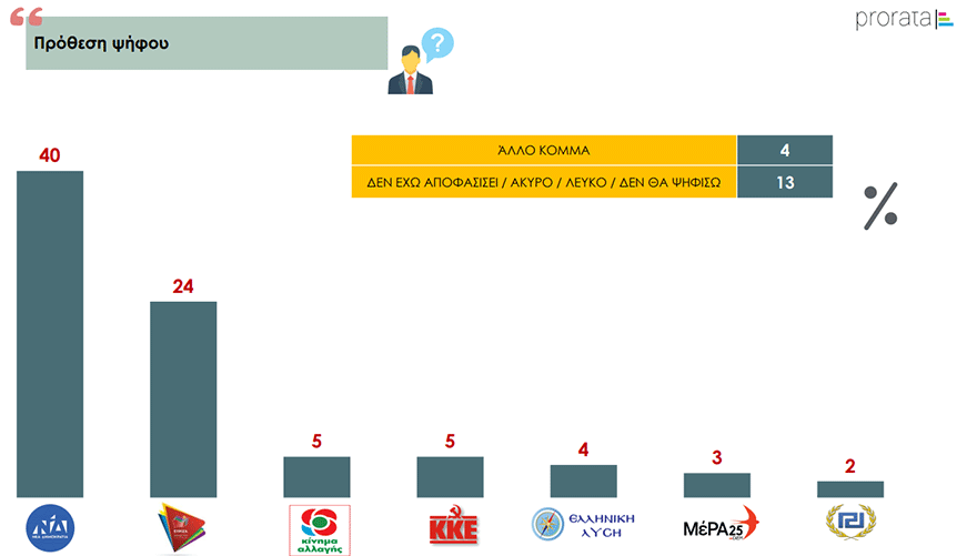 Ειδικότερα, στην πρόθεση ψήφου η Νέα Δημοκρατία συγκεντρώνει 40%, ενώ ακολουθεί ο ΣΥΡΙΖΑ 24% και έπονται: το Κίνημα Αλλαγής με 5%, το ΚΚΕ με 5%, η Ελληνική Λύση με 4% και το ΜέΡΑ25 με 3%. Το 4% απαντά «άλλο κόμμα» και το 13% δηλώνει πως δεν έχει αποφασίσει/θα επιλέξει άκυρο/λευκό ή δεν θα ψηφίσει.
