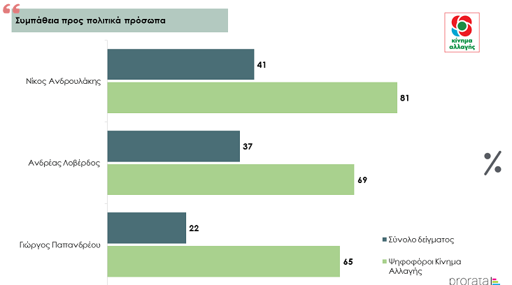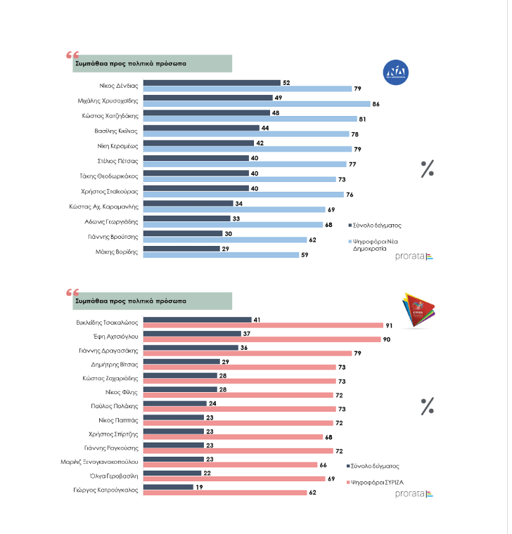 Στην ερώτηση σχετικά με τη συμπάθεια προς τα πολιτικά πρόσωπα, στη Νέα Δημοκρατία πρώτος έρχεται στο σύνολο του δείγματος ο Νίκος Δένδιας με 52% ενώ στους στους ψηφοφόφους του κόμματος πρώτος έρχεται ο Μιχάλης Χρυσοχοϊδης με 86%. Στον ΣΥΡΙΖΑ πρώτος έρχεται ο Ευκλείδης Τσακαλώτος με 41% στο σύνολο του δείγματος και 91% στους ψηφοφόρους του κόμματος. Στο Κίνημα Αλλαγής πρώτος έρχεται ο Νίκος Ανδρουλάκης με 41% στο σύνολο του δείγματος και 81% στους ψηφοφόρους του κόμματος.