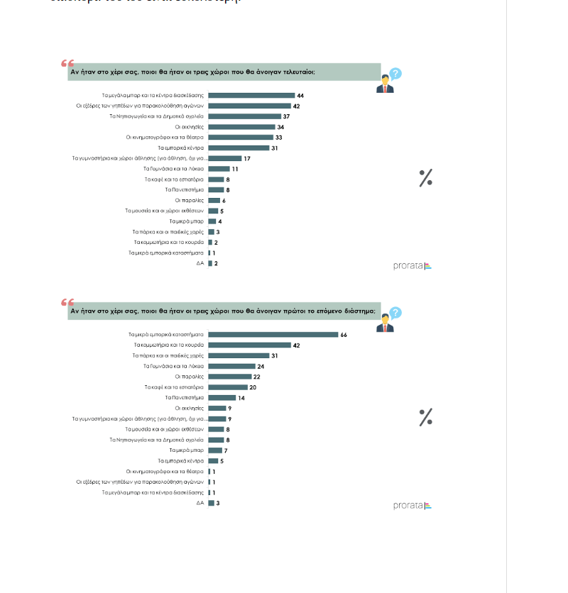 Στην ερώτηση «Αν ήταν στο χέρι σας, ποιοι θα ήταν οι τρεις χώροι που θα άνοιγαν τελευταίοι», το 44% των ερωτηθέντων απάντησαν τα μεγάλα μπαρ και τα κέντρα διασκέδασης, το 42% οι εξέδρες των γηπέδων για παρακολούθηση αγώνων, το 37% τα Νηπιαγωγεία και τα Δημοτικά σχολεία.