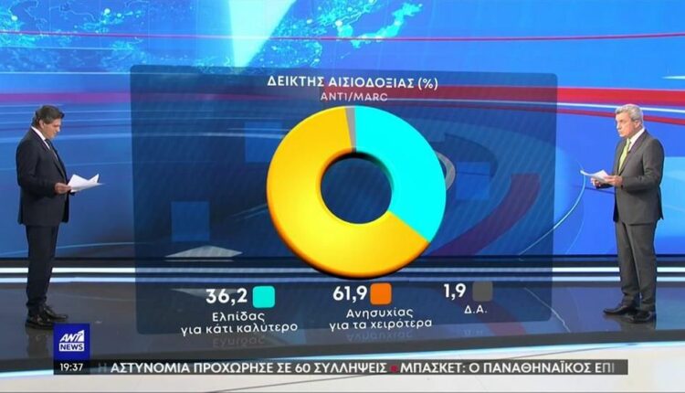 Ανησυχούν για τα χειρότερα 6 στους 10 Έλληνες με βάση τα αποτελέσματα του β! μέρους της δημοσκόπησης της Marc για τον ΑΝΤ1, για τα θέματα της τρέχουσας επικαιρότητας. Ωστόσο, ένα ποσοστό 36,2% δηλώνει ότι έχει ελπίδα για κάτι καλύτερο.