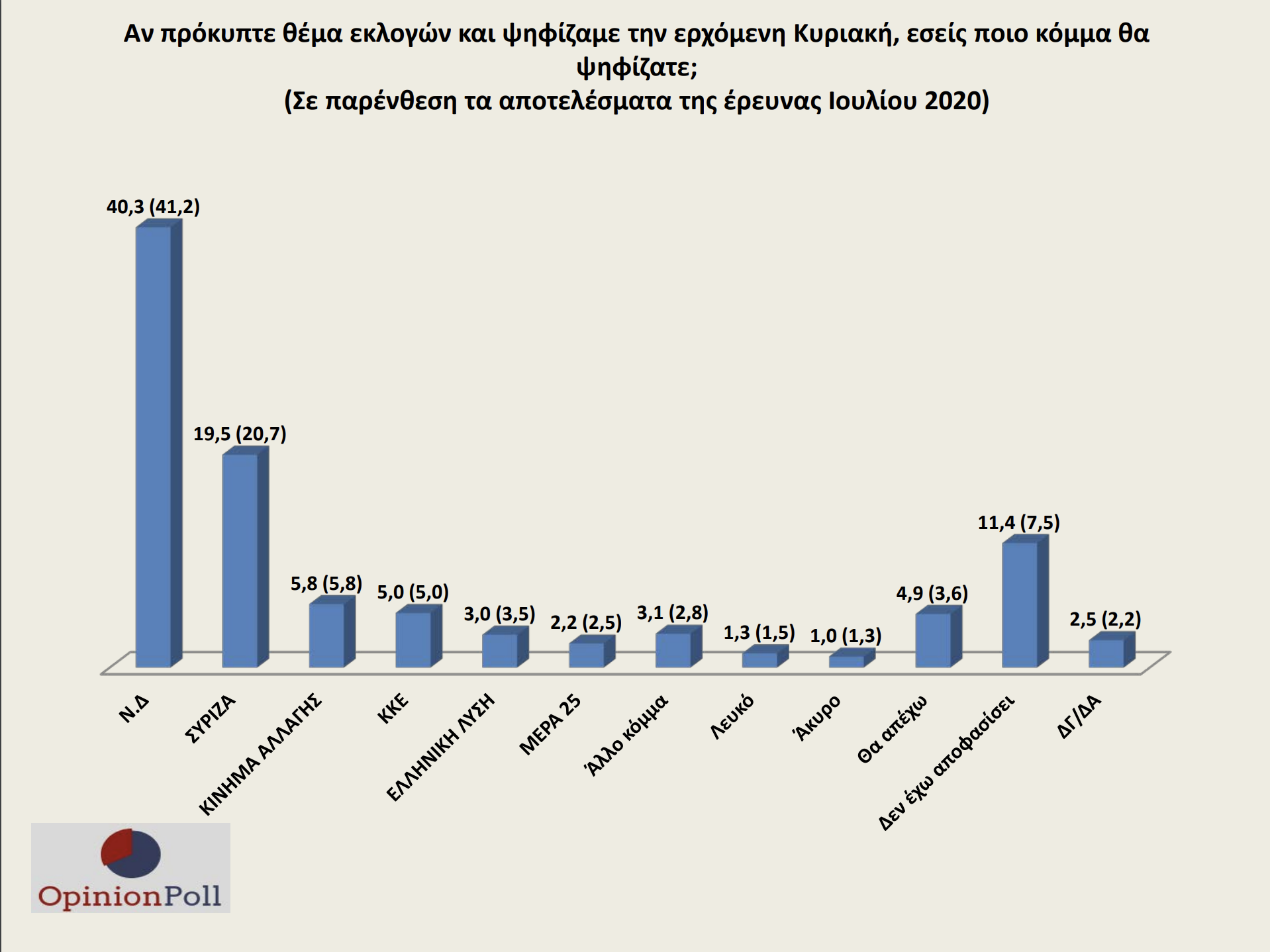 Ν.Δ έναντι του ΣΥΡΙΖΑ με 40,3% ( 41,2% τον Ιούλιο ) έναντι 19,5% ( 20,7% τον Ιούλιο).