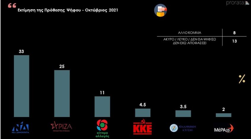 Αντίθετα, η μεγάλη αλλαγή έρχεται στο κέντρο. Σύμφωνα με την έρευνα, καταγράφεται μια εντυπωσιακή διαφοροποίηση της τάξης του 70% ως προς την επιρροή του Κινήματος Αλλαγής, το οποίο από το 6.5% της μέτρησης του Οκτωβρίου εκτοξεύεται σήμερα στο 11%. Όπως αναφέρει η εταιρεία, αναμφίβολα, η σημαντική αυτή μεταβολή συσχετίζεται με την εκλογή του Νίκου Ανδρουλάκη στην ηγεσία του κόμματος, επιβεβαιώνοντας την υπόθεση ότι η γενικευμένη αίσθηση αναγέννησης του κόμματος με νέα, προσλαμβανόμενα ως άφθαρτα υλικά, αναμφίβολα θα του έδινε μία νέα δυναμική την επόμενη μέρα.