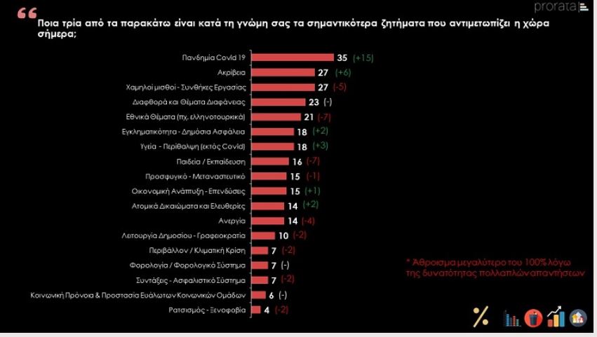 Την ίδια στιγμή, τα κρίσιμα ζητήματα της περιόδου δείχνουν να καταλαμβάνουν και πάλι σημαντικό χώρο στη δημόσιες και ιδιωτικές συζητήσεις μας. Πανδημία, ακρίβεια, χαμηλοί μισθοί, συνθήκες εργασίας, διαφθορά και θέματα διαφάνειας. Αναπόφευκτα, η έκρηξη των ημερήσιων κρουσμάτων και των θανάτων από Covid-19 στις αρχές του Νοεμβρίου οδήγησε στην ιεράρχηση της πανδημίας ως κορυφαίου ζητήματος της περιόδου από την κοινή γνώμη, περνώντας από την έκτη θέση της σχετικής κατάταξης στην πρώτη. Αντίστοιχα, η αναμενόμενη αύξηση της κατανάλωσης για την κάλυψη των ενεργειακών αναγκών των νοικοκυριών κατά τους ψυχρούς μήνες του χειμώνα μετακίνησε το ζήτημα της «ακρίβειας» από την πέμπτη θέση στην δεύτερη της σχετικής λίστας.