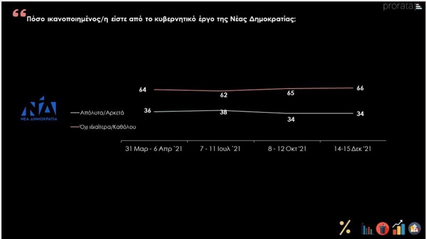 Τέλος, στη μεγάλη εικόνα, τα αποτελέσματα σκιαγραφούν εντεινόμενες συνθήκες αρνητισμού στην κοινωνία, αποκαλύπτοντας μια εικόνα δυσαρέσκειας σε σχέση με την οικονομική και πολιτική κατάσταση της χώρας. Ενδεικτικά, τα συναισθήματα που διακρίνονται αυτή την περίοδο σε σχέση με τα οικονομικές και πολιτικές εξελίξεις στη χώρα είναι η «απογοήτευση» και ο «θυμός», με την ικανοποίηση από το κυβερνητικό έργο να περιορίζεται ποσοστιαία οριακά πάνω από την εκλογική επιρροή του κυβερνώντος κόμματος, δηλαδή στο 34%.