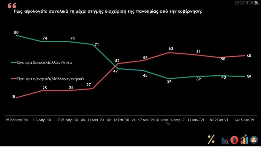 Παρά την σαφή υπεροχή της Νέας Δημοκρατίας έναντι των υπολοίπων κομμάτων της αντιπολίτευσης, η πρόσληψη της πανδημίας, ως του σημαντικότερου ζητήματος που αντιμετωπίζει η χώρα σήμερα δεν ευνοεί το κυβερνών κόμμα, δεδομένου ότι στη διαχείριση της περίπου 6 στους 10 ψηφοφόρους σταθερά πλέον εδώ και περίπου ένα χρόνο αξιολογούν αρνητικά τους κυβερνητικούς χειρισμούς.