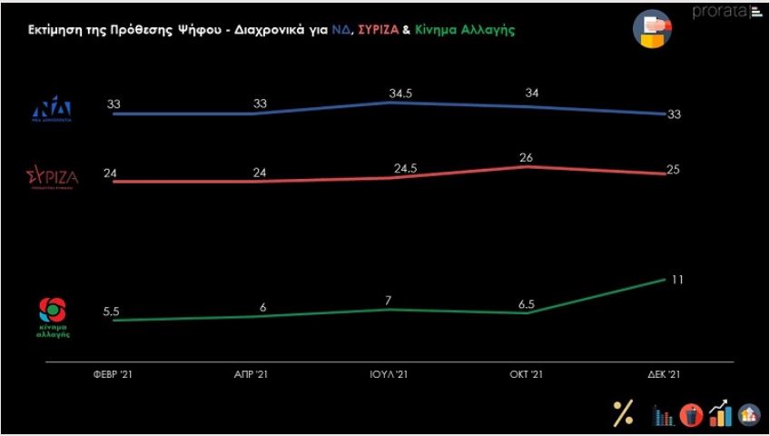 Σύμφωνα με τον «Σφυγμό» του Δεκεμβρίου, τη τελευταία μηνιαία μέτρηση πολιτικών τάσεων και εκλογικής επιρροής των κομμάτων, η Νέα Δημοκρατία (33%) και ο ΣΥΡΙΖΑ (25%) παρουσιάζουν οριακές απώλειες της τάξης του 1% συγκριτικά με την μέτρηση του Οκτωβρίου, διατηρώντας την μεταξύ τους ποσοστιαία απόσταση, η οποία ανιχνεύεται και αυτή τη φορά στο 8%. Αντίστοιχα, οριακές μόνο μεταβολές ανιχνεύονται ως προς την επιρροή του ΚΚΕ (4.5%), της Ελληνικής Λύσης (3.5%) και του ΜεΡΑ 25 (2%).