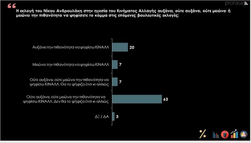 Αποδεικνύει επίσης, και το στοιχείο που εμφανίστηκε στις άλλες δημοσκοπήσεις. Δηλαδή τη μεγάλη άνοδο του ΚΙΝΑΛ, μετά τις εσωκομματικές εκλογές και τις προσδοκίες που αυξήθηκαν με την εκλογή του Νίκο Ανδρουλάκη.
