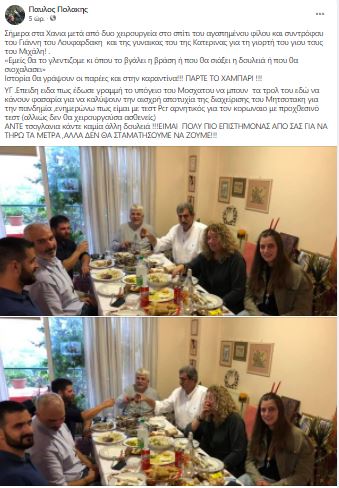 Προφανώς αναθαρρημένος και από την πλήρη κάλυψη του Αλέξη Τσίπρα που μίλησε για λάθος εικόνα αλλά για… επαρκείς εξηγήσεις, καθώς… δεν είχε πού αλλού να πάει μετά το χειρουργείο, ο πρώην υπουργός Υγείας επί ΣΥΡΙΖΑ και νυν βουλευτής, έσπευσε να γράψει και υστερόγραφο στην προκλητική ανάρτηση στο facebook, κάτω από τις φωτογραφίες με τα τραπεζώματα στα Χανιά εν μέσω καραντίνας.