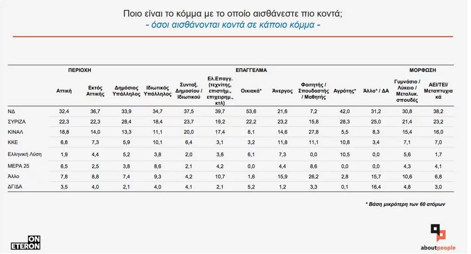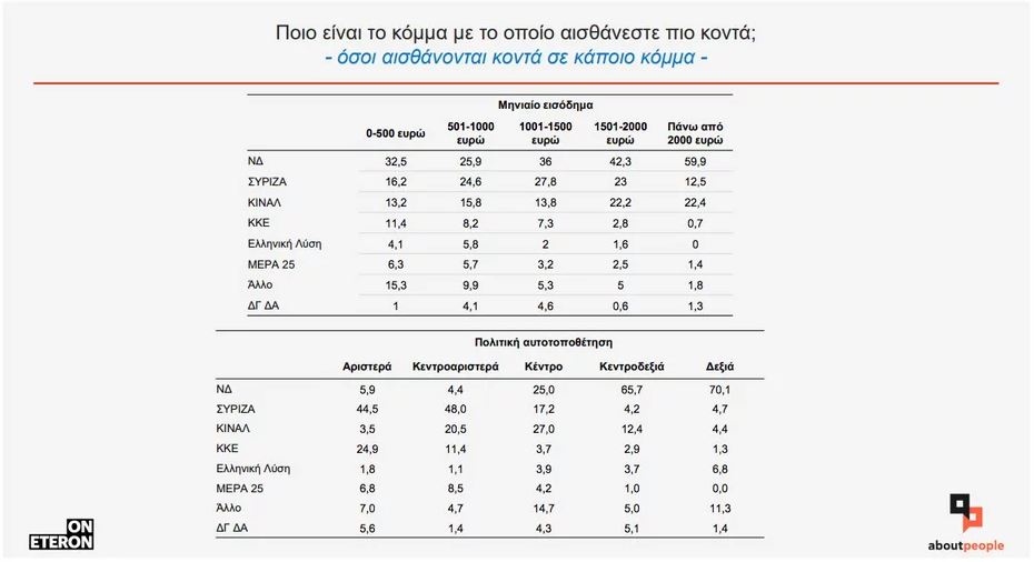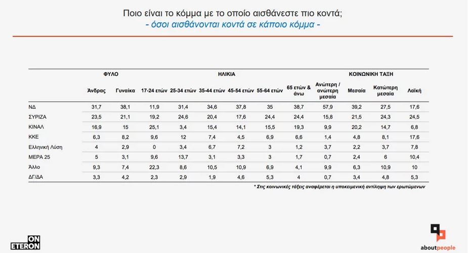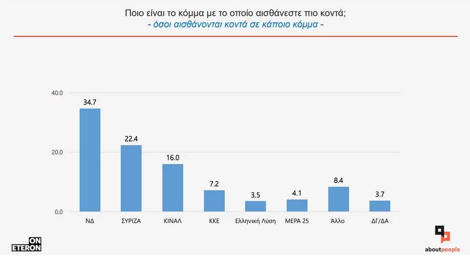 Στο ερώτημα «με ποιο κόμμα αισθάνεστε πιο κοντά» η ΝΔ συγκεντρώνει ποσοστό 34,7%, ο ΣΥΡΙΖΑ 22,4, το ΚΙΝΑΛ 16, το ΚΚΕ 7,2, η Ελληνική Λύση 3,5 και το ΜέΡΑ25 4,1.