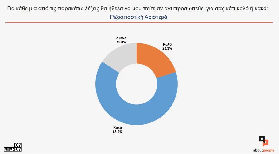 Χαρακτηριστικό των ευθυνών του ΣΥΡΙΖΑ είναι πως το 47,7% απορρίπτει την Αριστερά ως κάτι κακό σε ποσοστό 47,7% με το 61,8% να επιλέγει το «Κέντρο». Στο ερώτημα για τη Ριζοσπαστική Αριστερά (που εκπροσωπεί ο ΣΥΡΙΖΑ) αρνητικά απαντά το 63,9%.