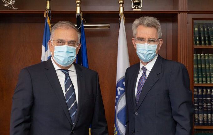 Eθιμοτυπική συνάντηση με τον Πρέσβη των ΗΠΑ στην Αθήνα κ. Τζέφρι Πάιατ είχε σήμερα στο Υπουργείο Προστασίας του Πολίτη ο κ. Τάκης Θεοδωρικάκος.