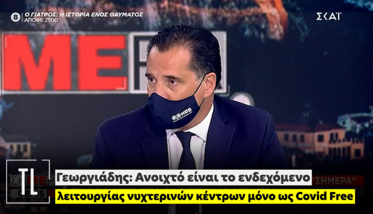 Ο Υπουργός Ανάπτυξης και Επενδύσεων, Άδωνις Γεωργιάδης, έκανε λόγο για πιθανότητα απόφασης της επιτροπής των ειδικών να λειτουργήσουν τα νυχτερινά κέντρα διασκέδασης ως covid-free, αποκλειστικά με εμβολιασμένους, μιλώντας στον ΣΚΑΪ.