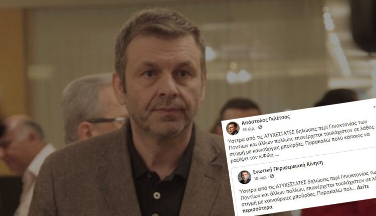 Ο Α. Γκλέτσος γράφει στην ανάρτησή του: “Ύστερα από τις ΑΤΥΧΕΣΤΑΤΕΣ δηλώσεις περί Γενοκτονίας των Ποντίων και άλλων πολλών, επανέρχεται τουλάχιστον σε λάθος στιγμή με καινούργιες μπούρδες. Παρακαλώ πολύ κάποιος να μαζέψει τον κ.Φίλη…”.