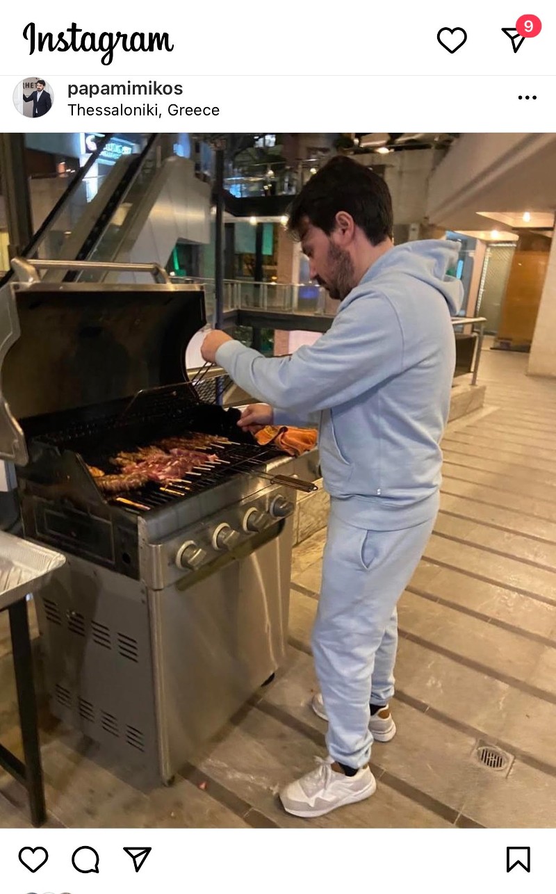-Έβλεπα και ξανάβλεπα την φωτογραφία που «ανέβασε» ο ανιψιός του Ιβάν Ανδρέας Παπαμιμίκος και δεν πίστευα στα μάτια μου. Ο παλιός γραμματέας της ΝΔ, την Τσικνοπέμπτη, θέλησε να το γιορτάσει, ψήνοντας σουβλάκια (γι΄ αυτή τη δουλειά κάνει) έχοντας ως φόντο μια κυλιόμενη σκάλα. Λέτε να πήρε προίκα κάνα εμπορικό κέντρο;