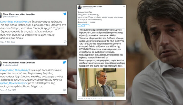 «Ο #Κουρτάκης_συκοφάντης ο δημοσιογράφος τρόφιμος της ΝΔ της λίστας Πέτσα,είναι ο μπούφος που μπροστά στο εξώδικο του Τσίπρα, καταπίνει “ουρές & τρίχες”. Σιχάματα της δημοσιογραφιάς & της πολιτικής πηγαίνουν αντάμα.Αυτή είναι η ΝΔ αυτά είναι τα μέλη της.Το καταλάβαμε,σας είδαμε», γράφει ο Νίκος Καρανίκας στην πρώτη του ανάρτηση, για να ακολουθήσει η δεύτερη: «#Παπαχρήστος #Κουρτάκης.Συνώνυμα των απατεώνων, συκοφαντών πεκινουά του Μητσοτάκη. Ξεφτίλες δημοσιογράφοι ξεφτιλισμένα κανάλια, αντάμα με την ΝΔ της διαφθοράς &των εγκλημάτων.Κουβέντα δεν λένε για #ανεμελος_Πρωθυπουργος με τα 3000 θύματα της ολιγωρίας κ νεοφιλελευθερου δόγματος».