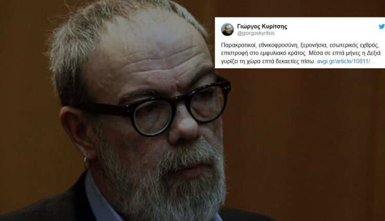 Ενώ καταλήγει: Παρακρατικοί, εθνικοφροσύνη, ξερονήσια, εσωτερικός εχθρός, επιστροφή στο εμφυλιακό κράτος. Μέσα σε επτά μήνες η Δεξιά γυρίζει τη χώρα επτά δεκαετίες πίσω.