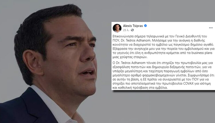 Ο Αλέξης Τσίπρας δήλωσε ότι ο Γενικός Διευθυντής του ΠΟΥ στηρίζει την πρωτοβουλία του ΣΥΡΙΖΑ για εξασφάλιση πατεντών εμβολίων για τον κορωνοϊού.