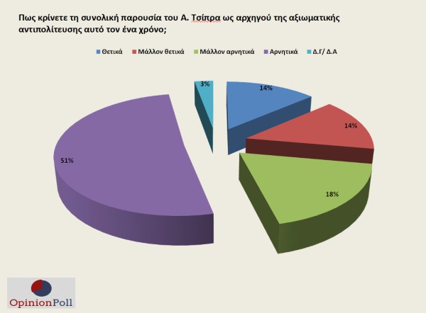 Τέλος, αρνητική είναι στην πλειοψηφία της η άποψη των πολιτών για τον Αλέξη Τσίπρα. Στο ερώτημα «Πως κρίνετε τη συνολική παρουσία του Α. Τσίπρα ως αρχηγού της αξιωματικής αντιπολίτευσης αυτό τον ένα χρόνο;», το 69% των πολιτών απαντάει «Αρνητικά/ Μάλλον Αρνητικά», ενώ «Θετικά ή Μάλλον Θετικά» απαντάει το 28% των πολιτών.