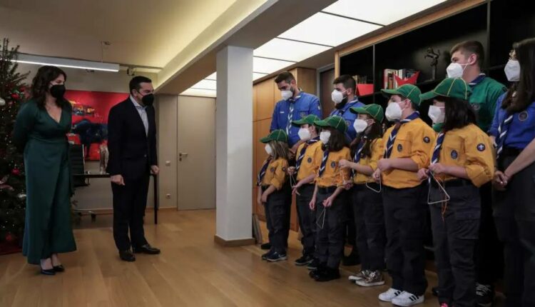 Στη συνέχεια, τα χριστουγεννιάτικα κάλαντα έψαλαν στον πρόεδρο του ΣΥΡΙΖΑ παιδιά από το Σώμα Ελλήνων Προσκόπων, προσφέροντάς του το επετειακό μαντίλι των 110 χρόνων του Σώματος και μία σφυρίχτρα.