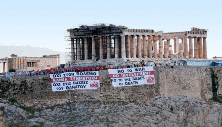 Δύο πανό με συνθήματα κατά του πολέμου αλλά και των στρατιωτικών βάσεων ανάρτησε το πρωί το ΚΚΕ στην Ακρόπολη.