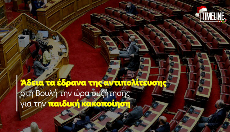 Άδεια τα έδρανα της αντιπολίτευσης στη Βουλή, την ώρα που ο Πρωθυπουργός ανακοίνωσε το πενταετές Εθνικό σχέδιο για την προστασία των παιδιών από τη σεξουαλική κακοποίηση.