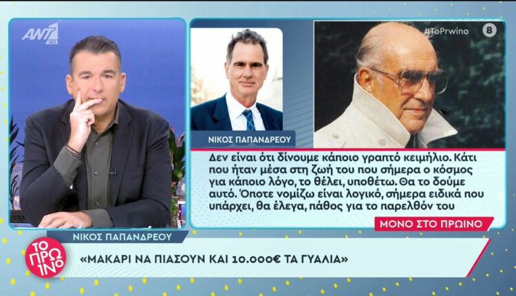 Σχετικά με το ποσό που θα ήθελε να… «πιάσουν» τα γυαλιά, ο Νίκος Παπανδρέου είπε: «Αν πήγαιναν 10.000 θα ήμουν χαρούμενος. Βάζω ψηλά τον πήχη, αλλά δεν ξέρεις μέσα στη σημερινή τρέλα πώς πάει» σημείωσε, μεταξύ άλλων.