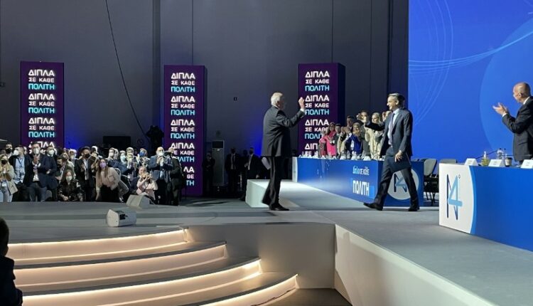 Τη θερμή χειραψία του Κυριάκου Μητσοτάκη με τον Βαγγέλη Μεϊμαράκη απαθανάτισε ο φακός του parapolitika.gr, καθώς ο πρόεδρος της οργανωτικής επιτροπής κατέβαινε από το βήμα για να κλείσει τις εργασίες του συνεδρίου ο πρόεδρος της ΝΔ και πρωθυπουργός.