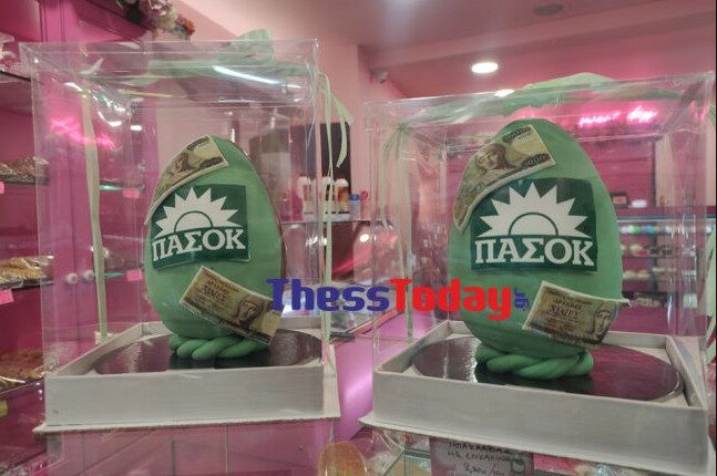 Πράσινη ζαχαρόπαστα, ο ήλιος ο πράσινος – το σήμα κατατεθέν του κόμματος – να φιγουράρει και χαρτονομίσματα κοσμούν τα πρωτότυπα σοκολατένια αυγά, τα οποία ξεπουλούν σαν τρελά.