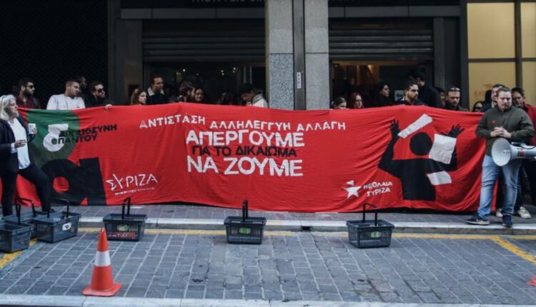 Αφήνοντας συμβολικά στο έδαφος άδεια καλάθια από σούπερ μάρκετ, το πανό που κρατούν τα μέλη του ΣΥΡΙΖΑ αναφέρει: «Αντίσταση-Αλληλεγγύη- Αλλαγή. Απεργούμε για το δικαίωμα να ζούμε».