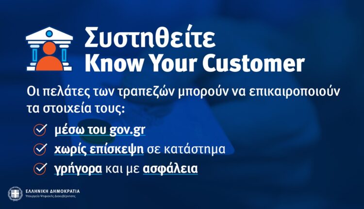 Μέσω του Know your Customer, οι πολίτες θα μπορούν να επικαιροποιήσουν στοιχεία που χρειάζεται η τράπεζά τους μέσω των μητρώων του Δημοσίου, δίχως να απαιτείται να πάνε σε υποκατάστημα, να καταθέσουν οποιοδήποτε έγχαρτο πιστοποιητικό, ή να υποβληθούν σε κάποια γραφειοκρατική διαδικασία. Η ενημέρωση γίνεται εξ ολοκλήρου ηλεκτρονικά, εξαλείφοντας άκοπα την ταλαιπωρία που ενέχει η τακτική επικαιροποίηση στοιχείων.