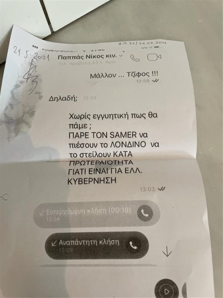 Όπως φαίνεται στο sms, o Χρήστος Καλογρίτσας γράφει στο μήνυμα προς τον Νίκο Παππά να επικοινωνήσει με τον Σάμερ Χούρι να πιέσει στο Λονδίνο «να το στείλουν κατά προτεραιότητα γιατί είναι για την ελληνική κυβέρνηση»!, ενώ μετά υπάρχει κλήση στη μεταξύ τους συνομιλία έτσι όπως είναι αποτυπωμένο στο αποδεικτικό στοιχείο.