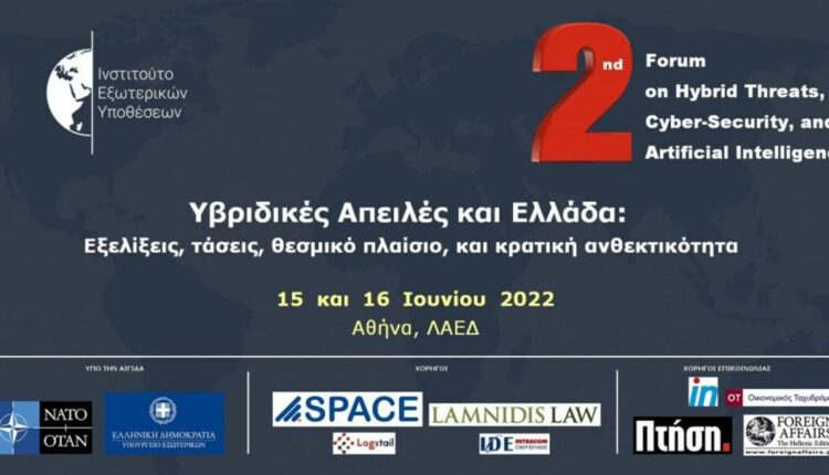 Με θέμα «Υβριδικές Απειλές και Ελλάδα: Εξελίξεις, τάσεις, θεσμικό πλαίσιο, και κρατική ανθεκτικότητα», πραγματοποιείται στις 15 και 16 Ιουνίου 2022 στην ΛΑΕΔ (Ρηγίλλης 1, Αθήνα) το 2nd Forum on Hybrid Threats, Cyber–security, and Artificial Intelligence, από το Ινστιτούτο Εξωτερικών Υποθέσεων (www.fainst.eu), και υπό την αιγίδα του ΝΑΤΟ και του Υπουργείου Εξωτερικών της Ελλάδος.