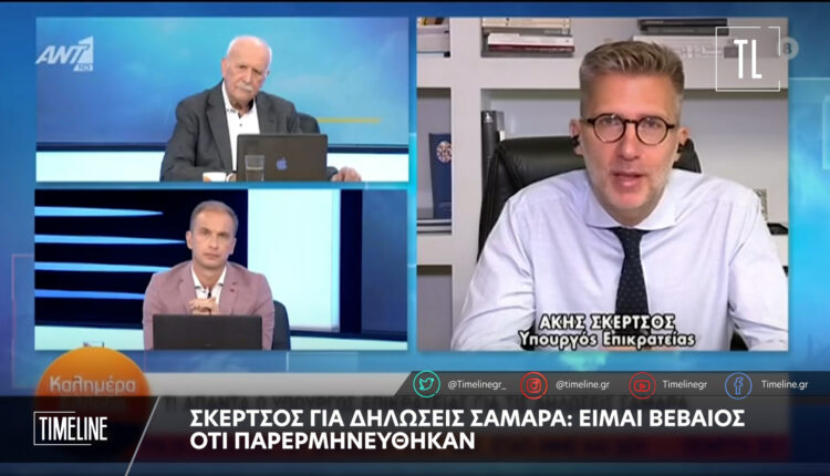 Ερωτηθείς για όσα δήλωσε, σε συνέντευξή του στα «Νέα Σαββατοκύριακο» ο πρώην πρωθυπουργός Αντώνης Σαμαράς, ειδικότερα για την κυβερνητική διεύρυνση, ο Α. Σκέρτσος απάντησε ως εξής: «Έχω υπάρξει συνεργάτης του κ. Σαμαρά την περίοδο 2012-14, στο γραφείο του κ. Στουρνάρα. Ο κ. Σαμαράς είχε κάνει τέτοιες επιλογές στο παρελθόν, συνεπώς είμαι βέβαιος ότι παρερμηνεύονται αυτά τα οποία λέει».